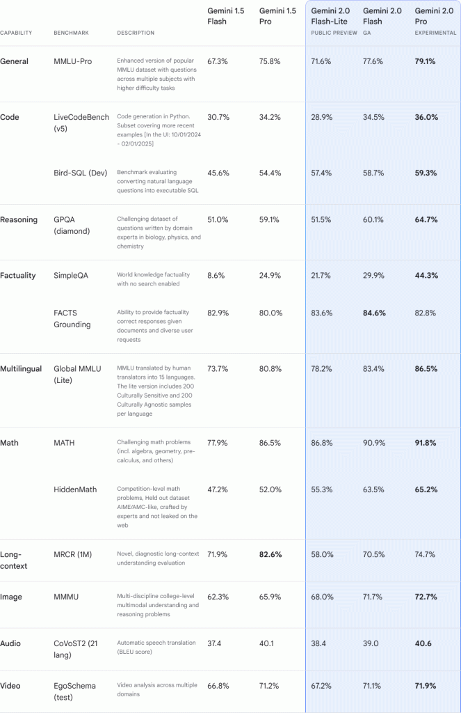 A tabela abaixo compara as capacidades de diferentes versões do Gemini, incluindo 1.5 Flash, 1.5 Pro, 2.0 Flash-Lite, 2.0 Flash e 2.0 Pro, em vários benchmarks. Ela mostra o desempenho de cada versão em tarefas como conhecimento geral, geração de código, raciocínio, factualidade, compreensão multilíngue, matemática, compreensão de contexto longo, compreensão de imagem, tradução de áudio e análise de vídeo. (fonte: Google)